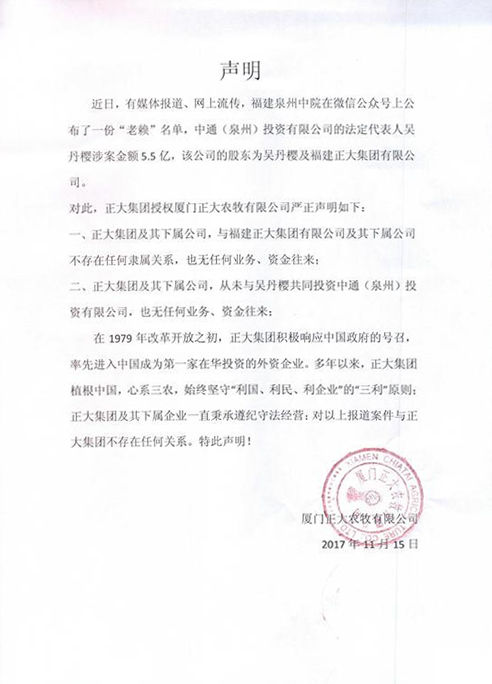 近日,有媒体报道、网上流传,福建泉州中院在微信公众号上公布了一份“老赖”名单,中通(泉州)投资有限公司的法定代表人吴丹樱涉案金额5.5亿,该公司的股东为吴丹樱及福建千亿体育有限公司。对此厦门正大农牧有限公司发布声明,内容如下: